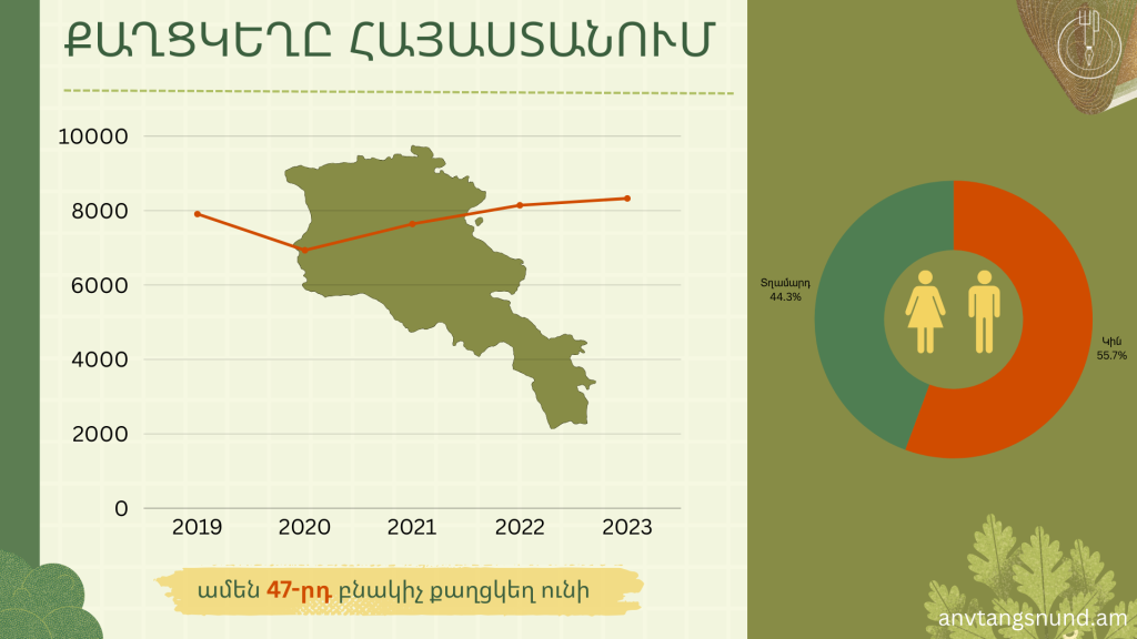Առողջապահության ազգային ինստիտուտի՝ 2024թ. հրապարակած վերջին տվյալների համաձայն (ամփոփված են 2023թ. տվյալները, հեղ.)՝ Հայաստանում քաղցկեղ ունի մոտ 63 000 մարդ, այսինքն՝ ամեն 47-րդը։ Մահերի պատճառների թվում քաղցկեղը 2-րդ տեղում է (ընդհանուր մահերի 20% հենց քաղցկեղից է, հեղ.)։