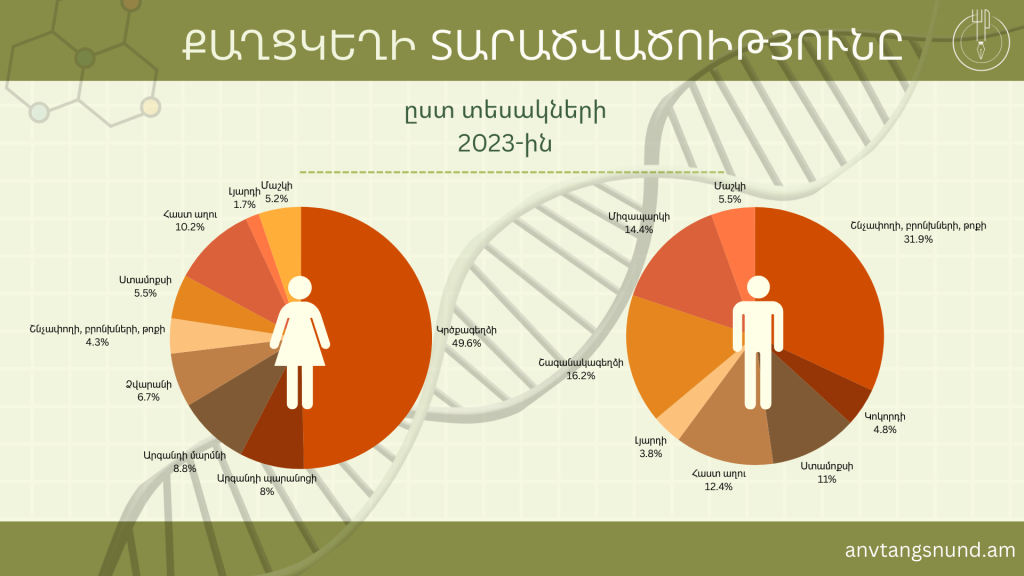 Տոկոսային շատ քիչ տարբերությամբ՝ քաղցկեղ ավելի շատ հայտնաբերվում է կանանց մոտ։ Օրինակ, 2023թ.ին արձանագրված քաղցկեղի 8327 դեպքից 55,7%-ը կանանց մոտ է, 44,3%-ը՝ տղամարդկանց։