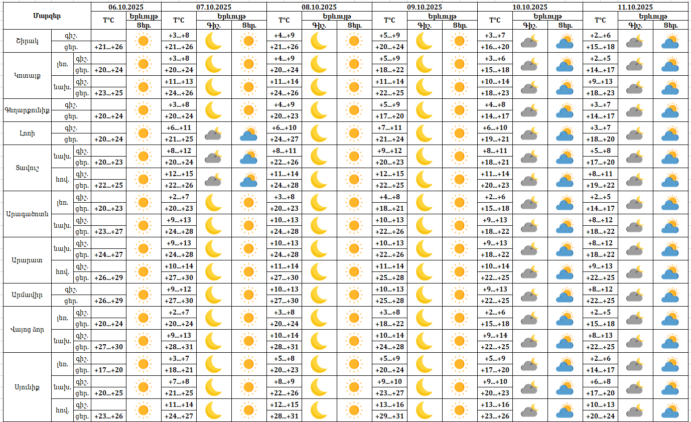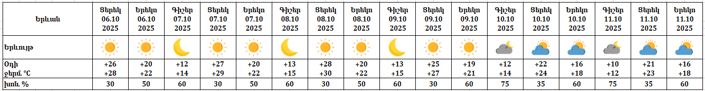 Օդի ջերմաստիճանը հոկտեմբերի 6-ի ցերեկը, 7-8-ին աստիճանաբար կբարձրանա ևս 2-3 աստիճանով: