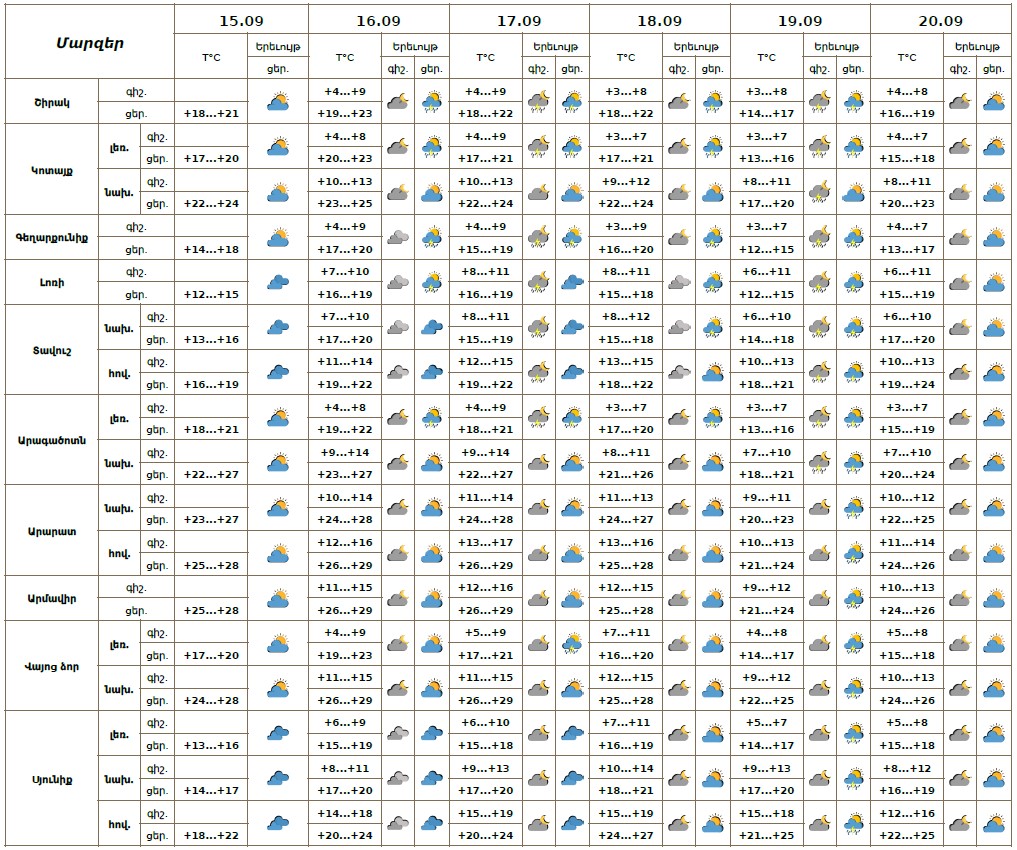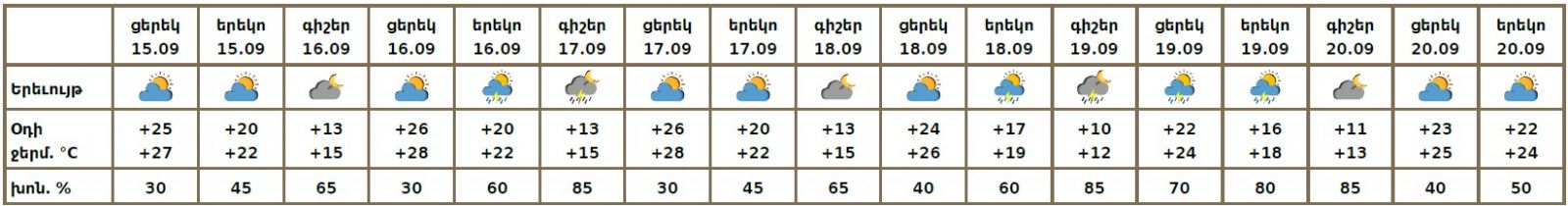 Սեպտեմբերի 15-ի ցերեկը 20-ին սպասվում է առանց տեղումների եղանակ։ Սեպտեմբերի 16-ի ցերեկը, 17-ին, 18-ի երեկոյան, 19-ի գիշերը առանձին շրջաններում, 19-ի ցերեկը շրջանների մեծ մասում սպասվում է կարճատև անձրև և ամպրոպ, ամպրոպի ժամանակ` քամու ուժգնացում 15-17մ/վ արագությամբ, հնարավոր է կարկուտ։