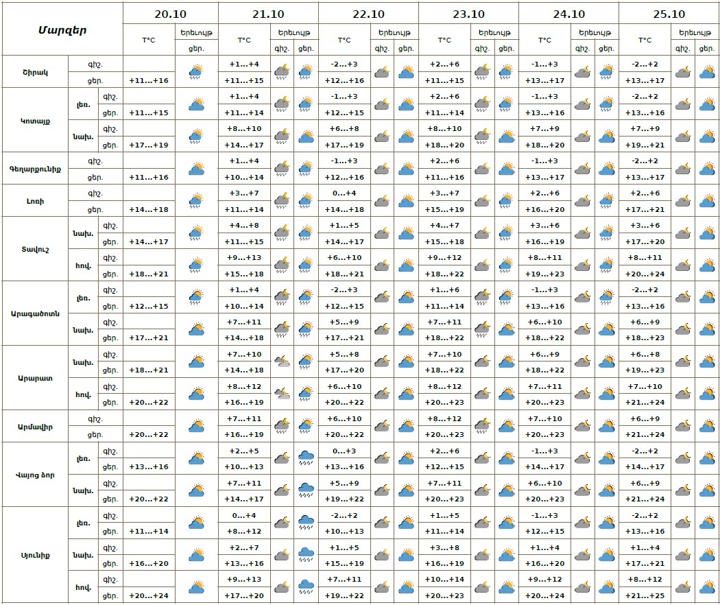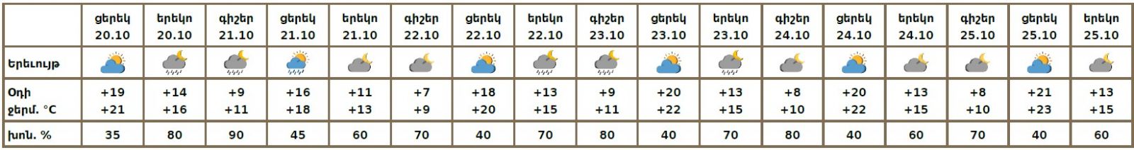 Հոկտեմբերի 20-ի ցերեկը, 21-ին, 22-ի ուշ երեկոյան, 23-24-ին առանձին շրջաններում սպասվում է կարճատև անձրև։ Հոկտեմբերի 25-ին պասվում է առանց տեղումների եղանակ։ Քամին արևմտյան՝ 2-5մ/վ, հոկտեմբերի 21-ին առանձին շրջաններում հնարավոր է քամու ուժգնացում՝ 16-19 մ/վ արագությամբ։