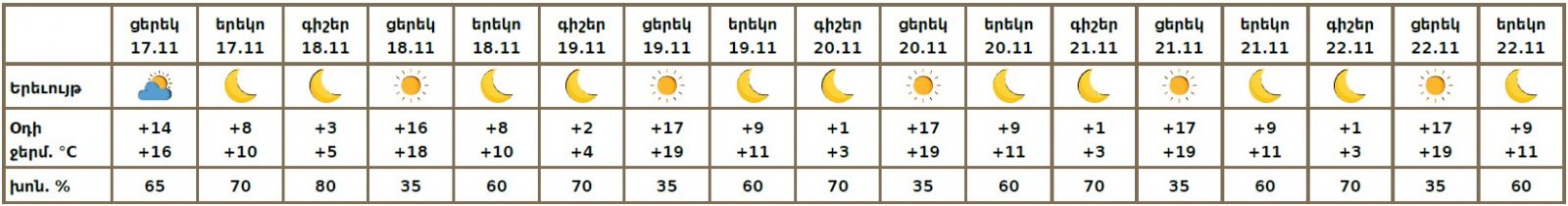 Նոյեմբերի 17-ի ցերեկը, 18-22-ին սպասվում է առանց տեղումների եղանակ, լուսադեմին Արարատյան դաշտում սպասվում է կարճատև մառախուղ: Քամին հարավարևմտյան՝ 2-5մ/վ: